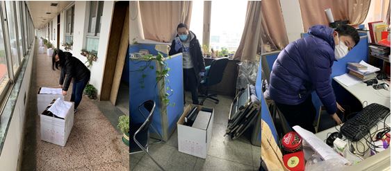 2月14日一早,民用院的李亚农、郑明星、刘国清、董贤锋、柳成立、俞波等多位同志组成特勤服务小组,正急忙赶往公司办公大楼。由于武汉市实施公共交通及私家车禁行规定,他们在有限的防护下,顶着寒风,有的步行,有的骑单车前往公司。在一间间办公室,不但要准确快速拆卸并打包需送至员工家中的电脑设备计30台,还要在百余台电脑上安装远程办公服务端软件,拷贝众多同事们所需的各类文件。因人数较多,安装、整理、拷贝、发送等工作量大且繁琐,他们从早一直忙到下午五点多钟,中午吃泡面充饥,认真处理每个工作环节,期间不断与同事们沟通确认,保证大家所需的文件无遗漏并能顺利进行远程操作。