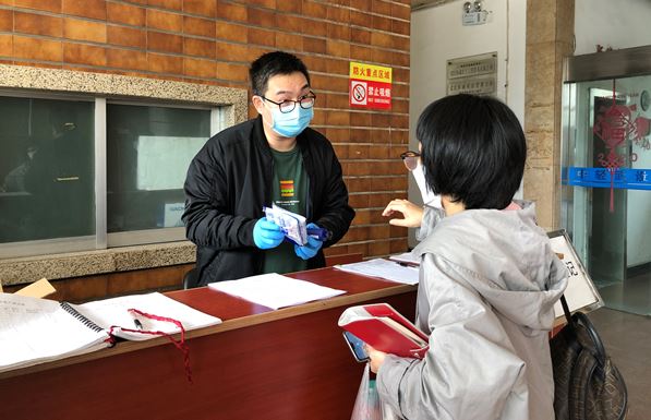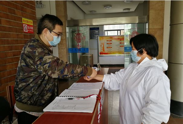 对入楼人员进行体温监测、健康码核验和出入登记
