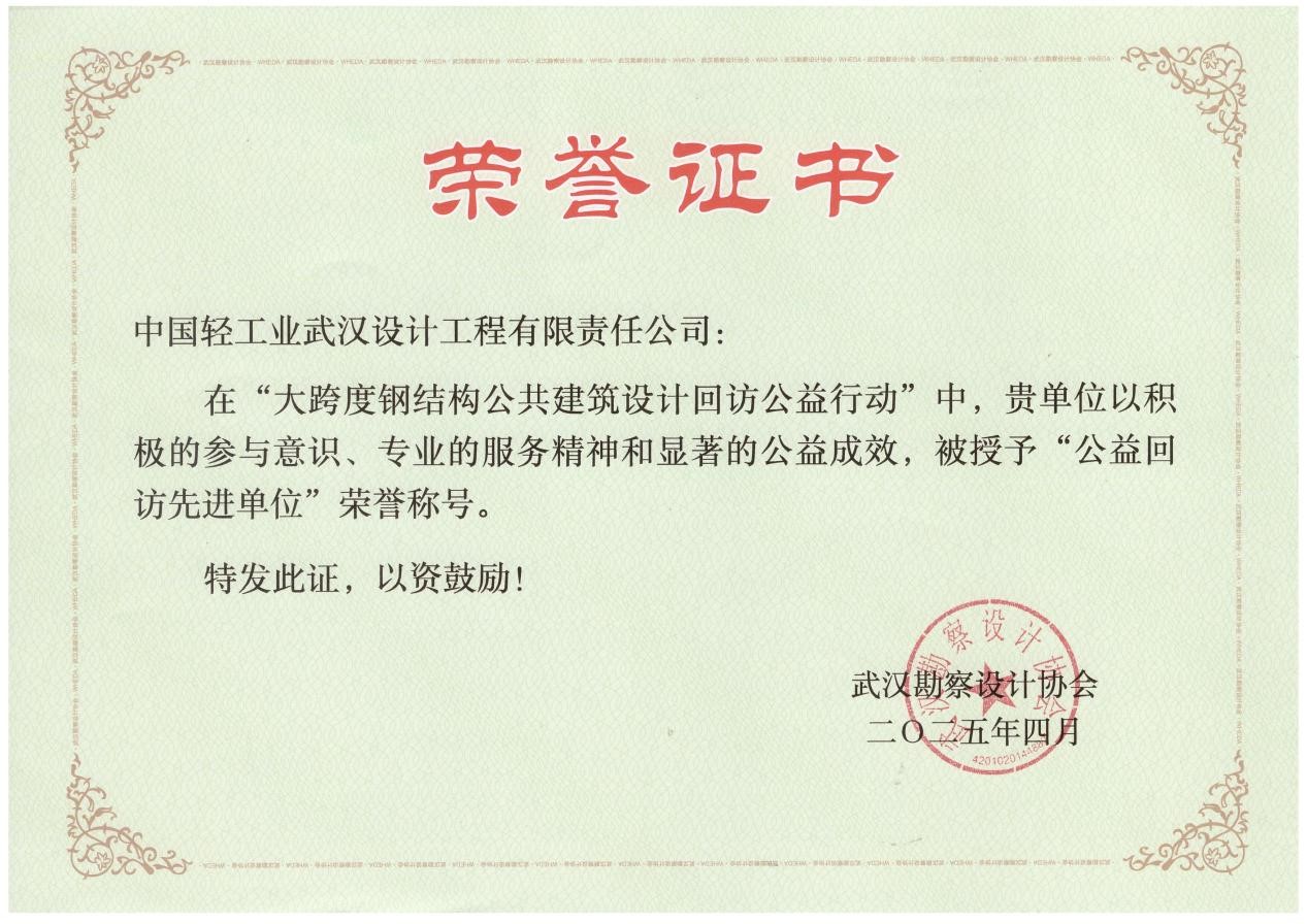 公益回访先进单位"荣誉称号的取得,充分体现了武汉公司在建筑设计尤其是大跨度钢结构公共建筑设计领域的专业能力与服务水平,也是对公司积极履行社会责任、投身公益事业的高度认可。武汉公司将以此为契机,继续秉持专业精神,深化专业人才培养,不断提升设计服务能力,积极参与各类公益活动,持续为建筑行业发展和社会建设贡献更多力量。