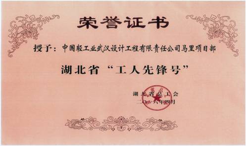 根据湖北省总工会《关于推荐评选2016年全国和湖北五一劳动奖的通知》(鄂工办〔2016〕5号),经湖北省经贸工会推荐,我公司马里项目部申报了"湖北省工人先锋号",经过层层评选,成为全省11个获奖单位之一,荣获"湖北省工人先锋号"称号!