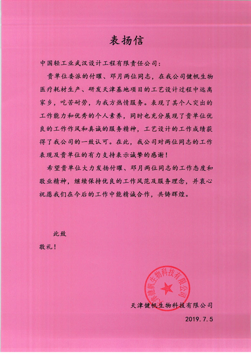 近日,我部门收到业主天津健帆生物科技有限公司发来的表扬信。 经了解,7月初我部门付曜和邓月两位员工赴天津向业主汇报生产车间和仓库的工艺布局方案,并积极与业主进行技术交流,对每个功能间进行详细核定,确保其满足工艺生产需求并最大化利用厂区面积。在此期间,两位同志业务优秀、善于沟通、热情服务、真诚奉献,其工作得到了业主高度认可。