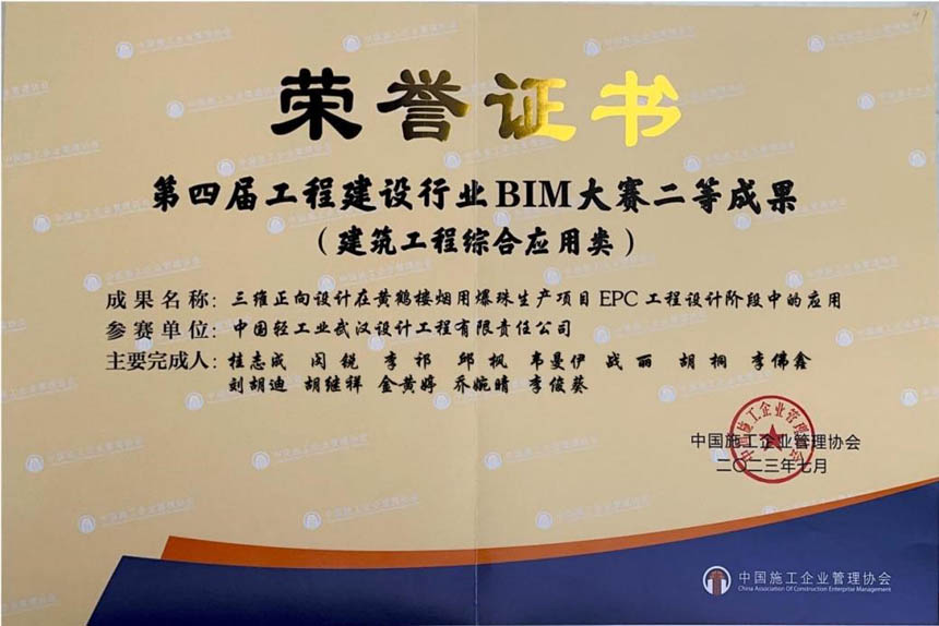 我公司参赛作品《三维正向设计在黄鹤楼烟用爆珠生产项目EPC工程设计阶段中的应用》荣获第四届工程建设行业BIM大赛建筑工程综合应用类二等成果!