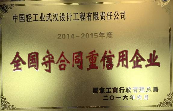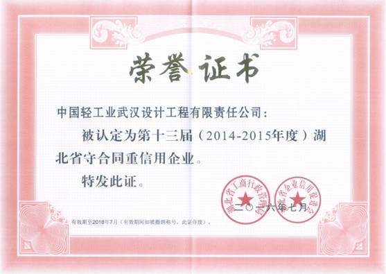 日前,我公司继续被湖北省工商行政管理局认定为第十三届(2014—2015年度)湖北省"守合同重信用"企业,并且通过了湖北省工商局推荐和国家工商总局的考核评审,最终荣获国家工商总局2014-2015年度"全国守合同重信用"企业称号。这已经是公司连续五届荣获此荣誉。