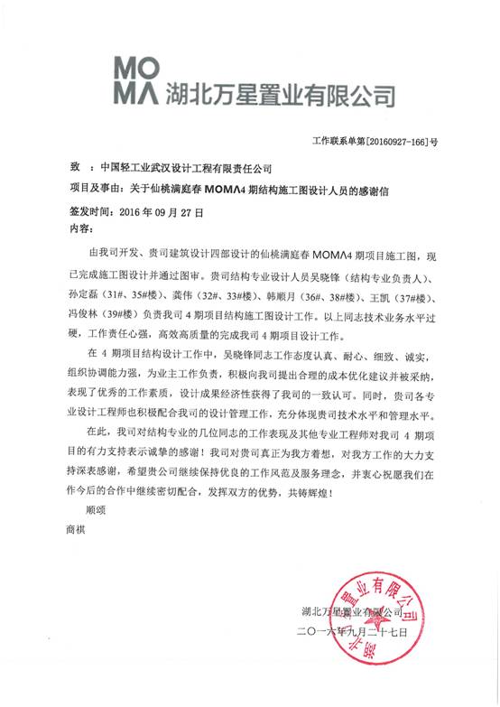 近日武汉公司收到当代集团湖北万星置业有限公司仙桃满庭春MOMΛ项目部专门发来的一份感谢信。信中对公司建筑设计四部承担仙桃满庭春MOMΛ四期项目的所有设计人员的技术水平以及工作态度表示了赞扬与肯定,特别对结构专业设计人员予以了点名表扬,称赞他们在设计过程中展现出的优秀工作能力——过硬的技术水平和认真负责的工作态度。