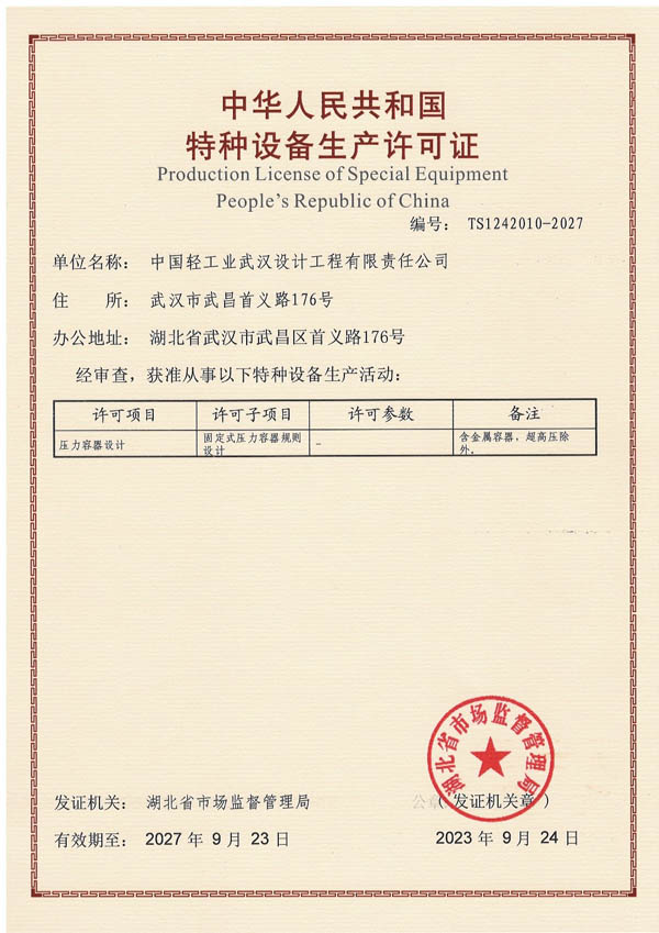近日,在技术质量部的组织下,经工业工程一院和设备成套工程分公司主办,各相关部门通力配合,公司压力容器设计许可证换证工作顺利完成,取得固定式压力容器规则设计许可证,资质范围由原D1D2级升级为D1D2A1A2A3级。