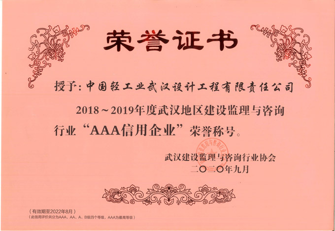 近日,武汉建设监理与咨询行业协会公布了2018~2019年度武汉建设监理咨询企业信用等级评价的结果,中国轻工业武汉设计工程有限责任公司喜获信用等级AAA级,为该奖项的最高级别。