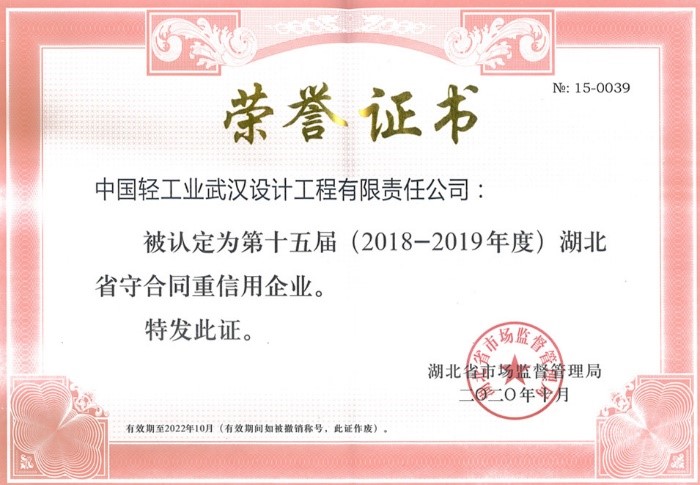 日前,我公司被湖北省市场监督管理局认定为第十五届(2018—2019年度)"湖北省守合同重信用"企业,这是公司连续七届获此荣誉。