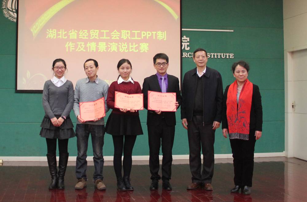 由公司工会主席童南莹领导、综合部王莹为领队、工业事业三部吴磊为主讲人、综合部李巧霞为PPT制作、生产技术部董家宙为技术支持组成的团队,在12月10日的省经贸工会直管单位PPT制作及情景演说大赛中,以独特的构思、简洁的表现、动情的演讲征服了现场的观众和评委,夺得比赛的桂冠——一等奖,并以优异的团队表现荣获优秀组织奖。