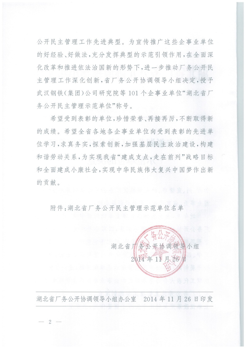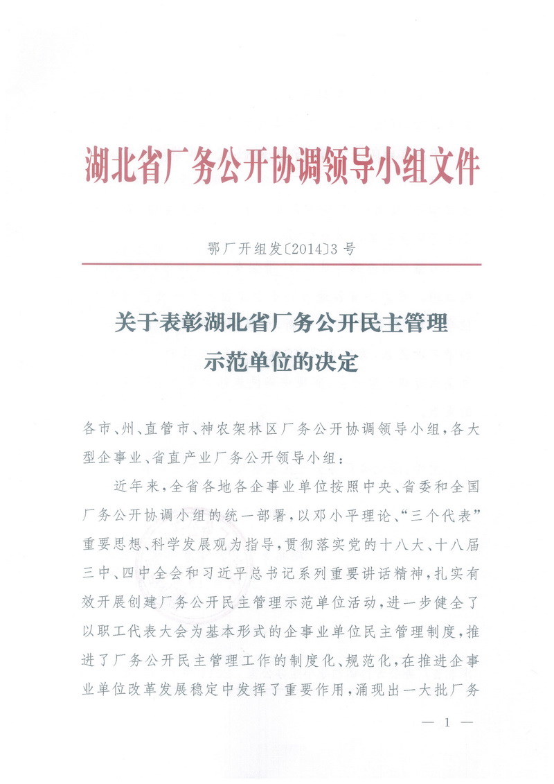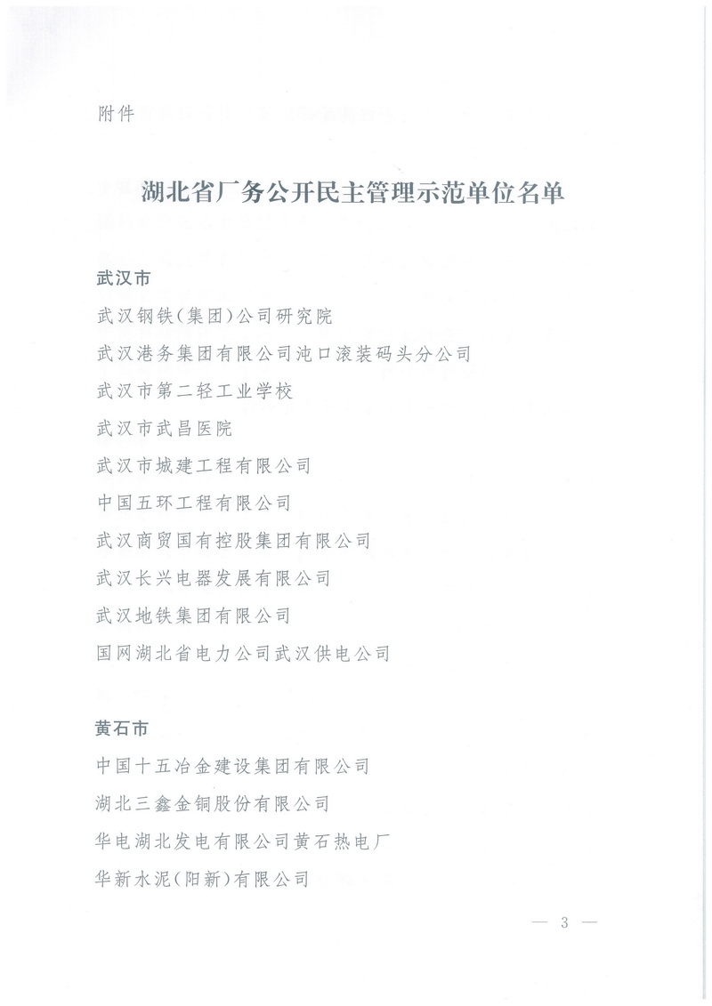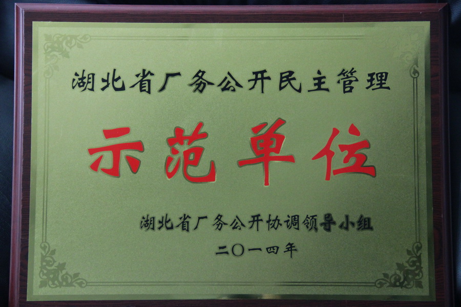 我公司被授予湖北省厂务公开民主管理示范单位荣誉称号