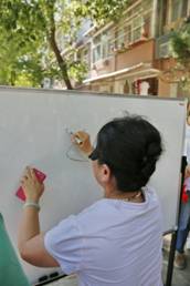 "锦上添花趾压板"——队员们脚踩趾压板、两眼一抹黑,蹦跳摸索着奔向前方咫尺之遥却欲触难及的画板,画下姿态万千的"花"。莫论画板上绽放的"花"奇异妖娆,艰难道路上的鼓励和引导是最难得的坚实依靠。