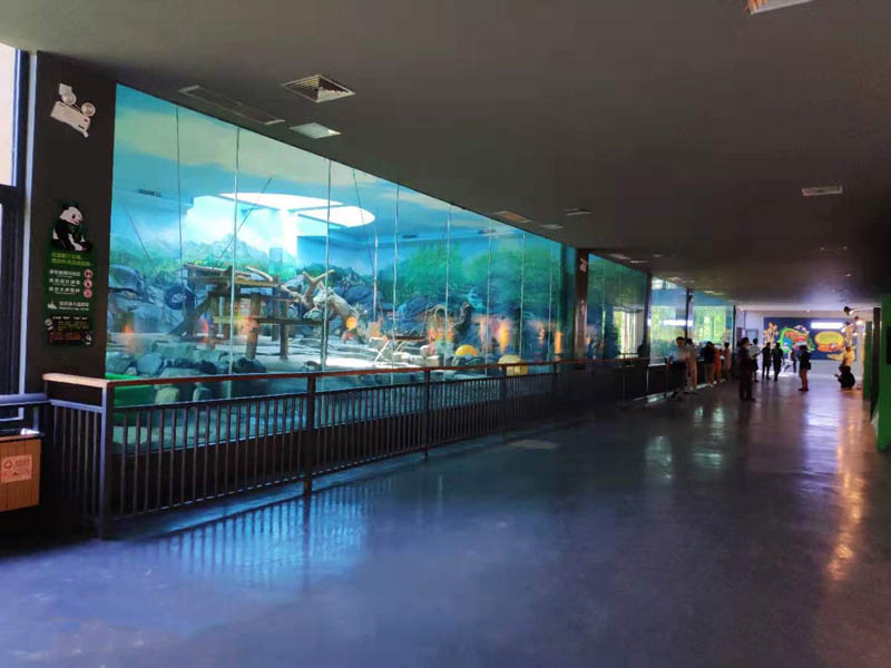 新大熊猫馆附属的两个东西外活动息栖场地分别为1000平方米和800平方米,巧妙地设置了熊猫专用通道与内展区及兽舍连通。场馆分为内展示区、内饲养区、饲料加工储存区和管理区等,其中内展示区设2间展厅,面积均为216平方米,地面内高外低,净高大于4.5米,展厅内部模拟大熊猫生活场景,设置了娱乐器具、景观壁画、天空屋顶等。另外,还在外侧游人参观区建立了400平方米的科普展厅。