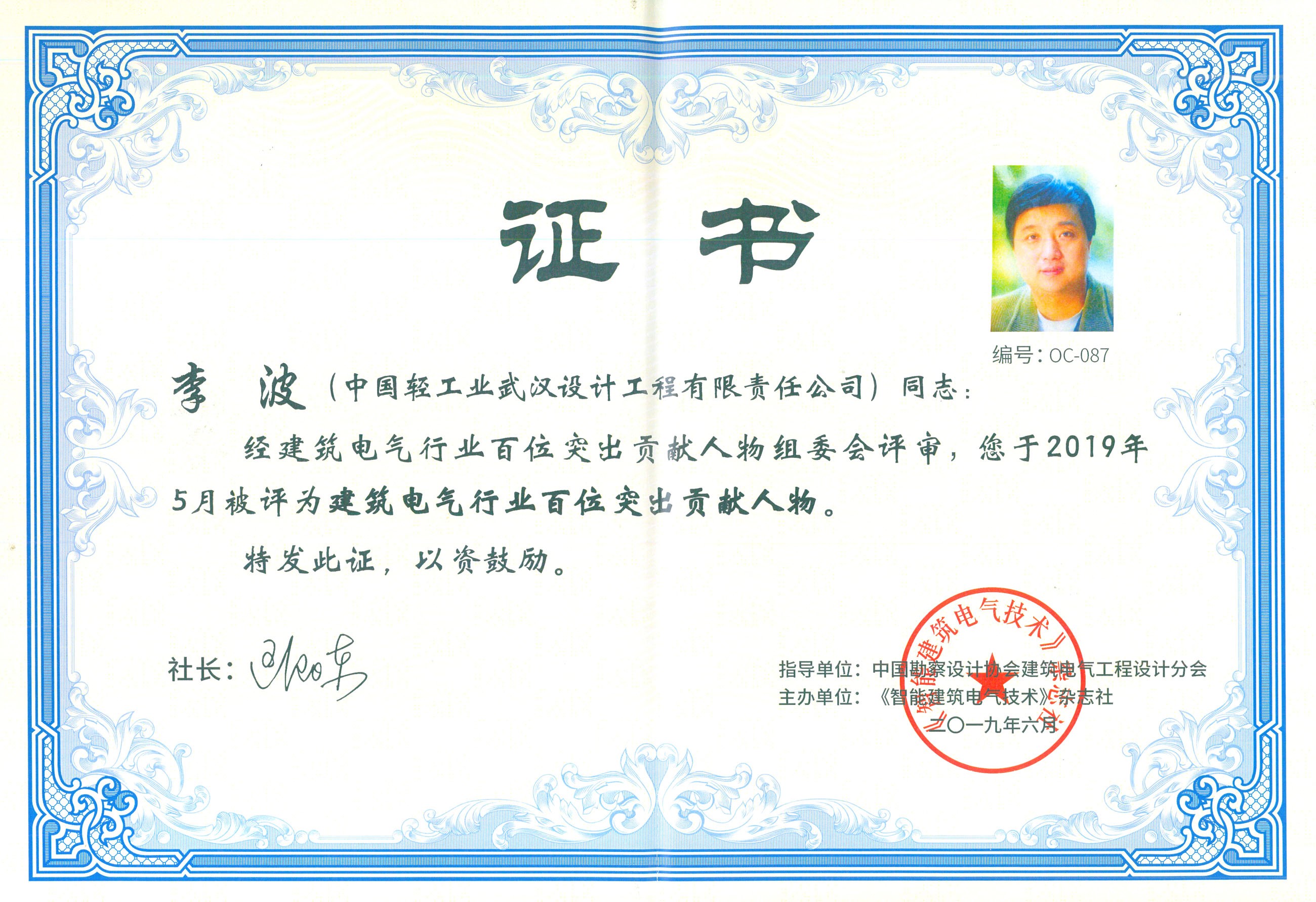 喜讯│中轻武设李波入选“建筑电气行业百位突出贡献人物”