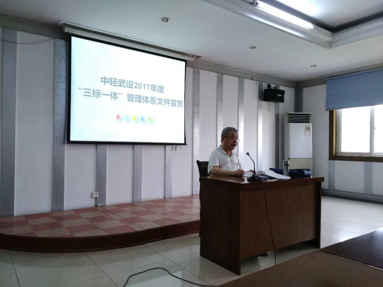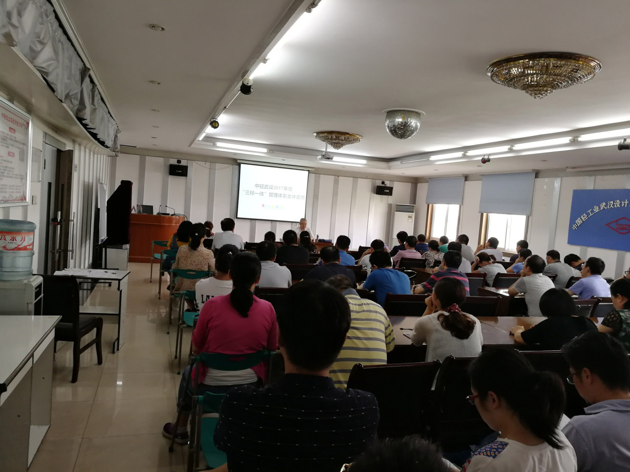 2017年8月22日下午,中轻武设2017年度"三标一体"管理体系文件宣贯在公司416会议室举行。本次"三标一体"管理体系宣贯及培训由公司副总工谭维毅主讲,各部门所总、项目负责人、副项目负责人等80余人参加了培训。